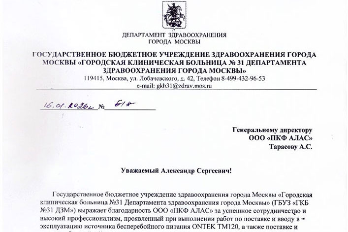 Сертифицированный партнёр ONTEK – московская компания АЛАС – успешно завершила проект модернизации системы бесперебойного электропитания для ГБУЗ "Городская клиническая больница №31 Департамента здравоохранения города Москвы". В данном проекте требовалось заменить устаревший и выработавший свой ресурс ИБП иностранного производства на современное и надёжное решение. В качестве такого решения Заказчиком был выбран ИБП ONTEK TM120 мощностью 120 кВА/кВт.