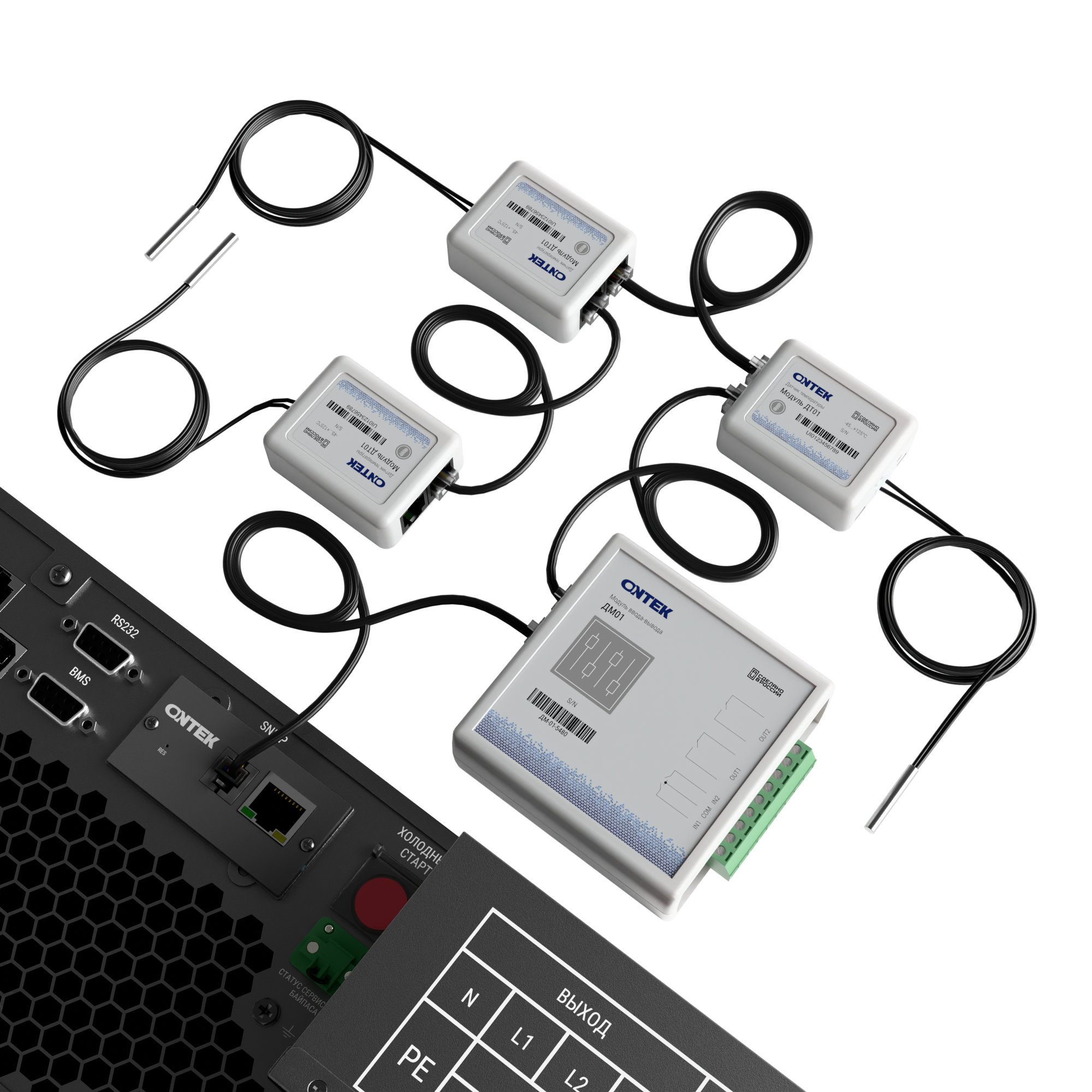 Реализация. Три модуля ДТ01 размещаются в разных зонах помещения (горячие коридоры, зоны с плотной компоновкой). При достижении порога на любом из датчиков через выход OUT1 включается прецизионный кондиционер. Все события фиксируются в журнале вместе с данными о состоянии ИБП.