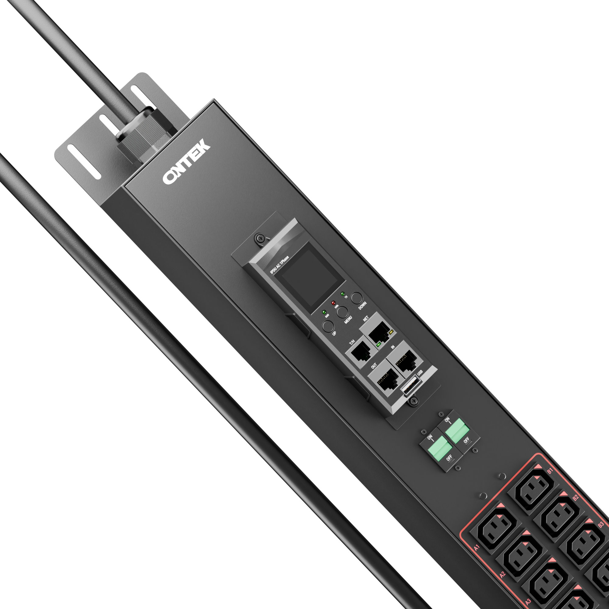 ONTEK PDU Metered представляют собой модифицированные базовые PDU, оснащенные измерительным модулем с ЖК-дисплеем, на котором отображаются показания в В, Вт, А и кВт⋅ч. Возможности: