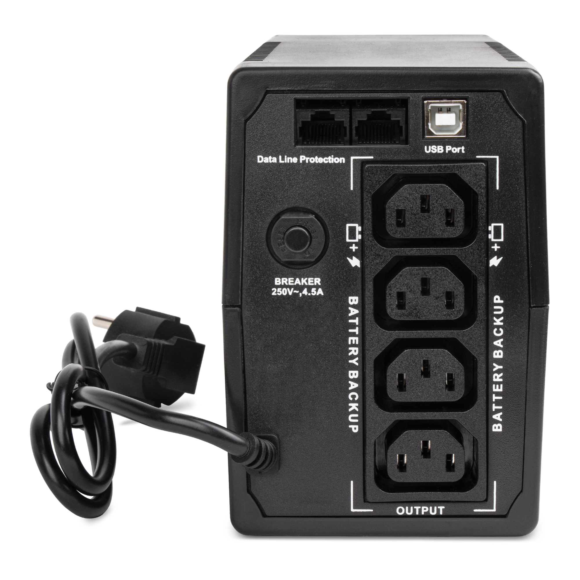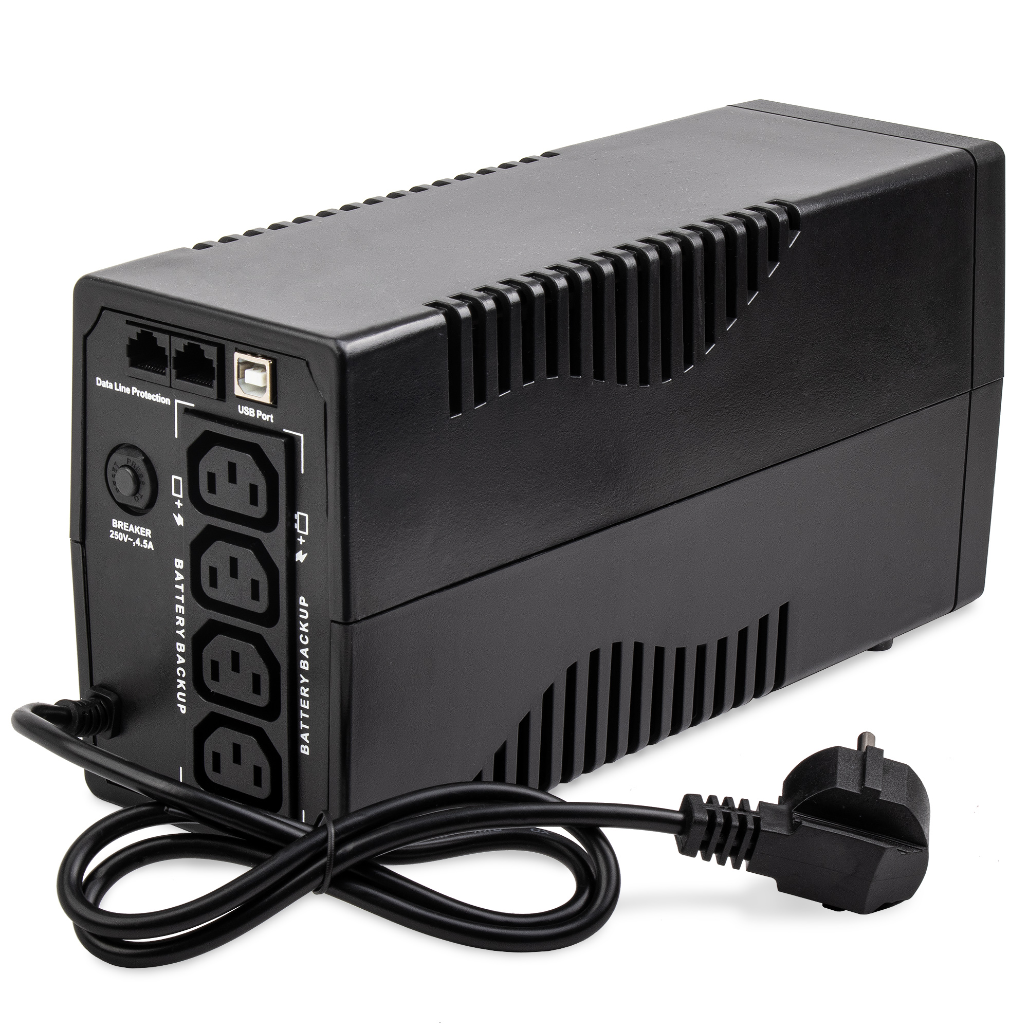 Линейно-интерактивный ИБП ONTEK 3S 550 мощностью 550ВА/300Вт. Вход: кабельный ввод с вилкой. Выход: IEC-320-C13 × 4 шт. Свинцово-кислотный аккумулятор с клапанным регулированием, не требующий обслуживания 12В/4,5Ач × 1шт.