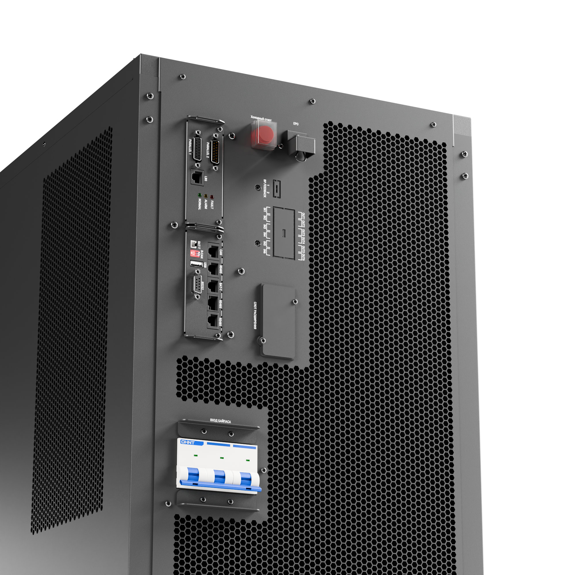ИБП формата Rack/Tower. Мощности 10-30 кВА - размер 3U. Мощности 40/60 кВА - размер 4U. Возможность параллельной работы до 4 ИБП с общей батарейной ёмкостью. Выходной коэффициент мощности PF = 1.